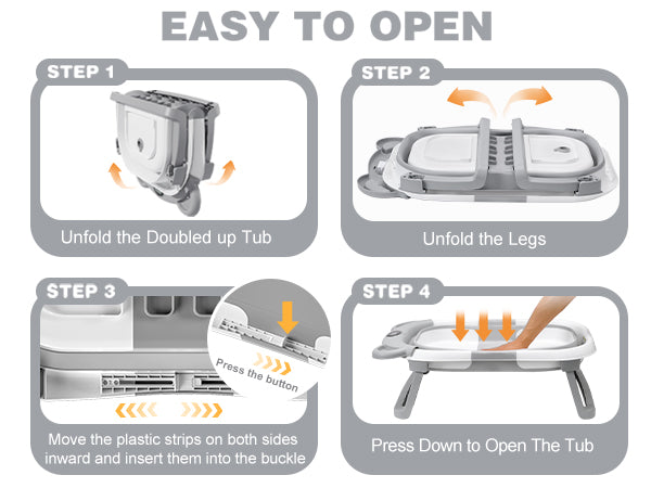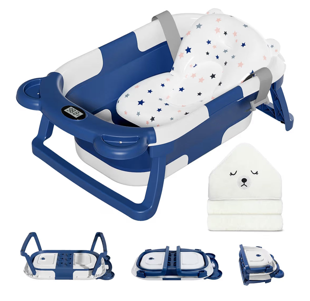 The collapsible bathtub is designed to accompany your baby from newborn to toddler(0-36 months) .Made with premium PP+TPE materials, our infant bath tub guarantees safety, resilience, and peace of mind. Odor-free and bite-proof, it’s gentle on your baby’s skin.